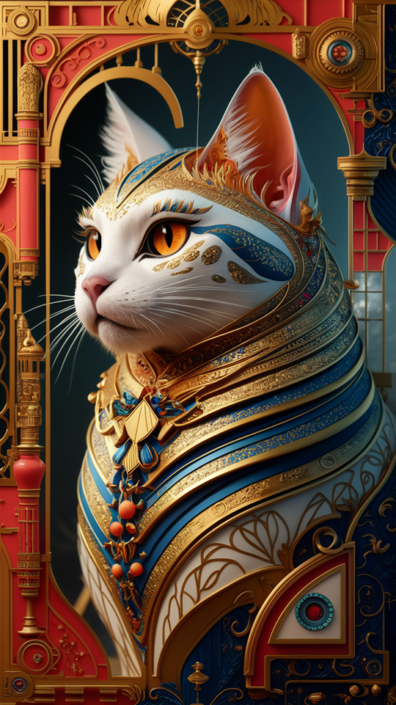 アール・ヌーボー、エジプト風アールデコ、モンドリアンのスタイル、そしてゴッホの『星月夜』の要素を巧みに組み合わせた革新的なデジタルアートの傑作です。主役は、精巧な金と青の模様に赤と黄色のアクセントが施された威厳ある白猫。その大きなオレンジ色の瞳は遠くを見つめ、見る者を魅了します。ファッションやポスター、建築的な要素からインスピレーションを受けたこのコンセプチュアルなイラストは、映画的なポートレート写真スタイルで表現され、印象的な3Dレンダリングが施されています。繊細なデザイン、幾何学的なパターン、クリーンなラインが調和したこの作品は、コーラル、ゴールド、青、黄色の鮮やかな色彩が特徴で、アニメやイラスト、コンセプチュアルアートが融合することで、観る者に感動を与えます。